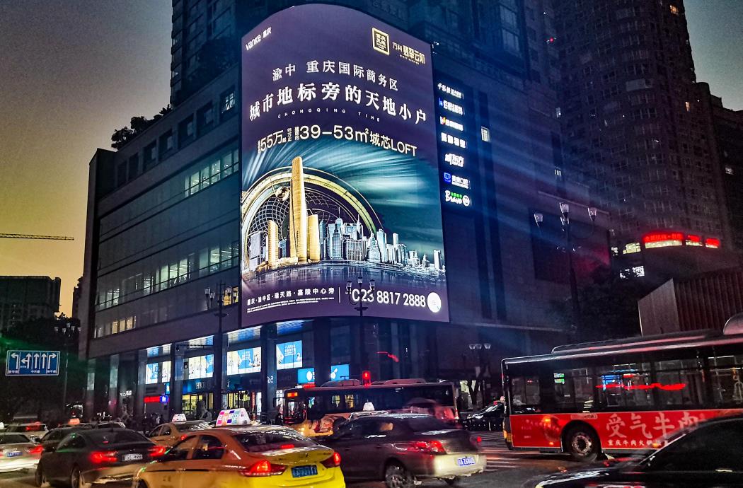 解放碑壹號屏坐落于解放碑CBD門戶,合景聚融廣場幕墻,左側(cè)為進出解放碑車流 量最大的十字進階——解放碑步行街。