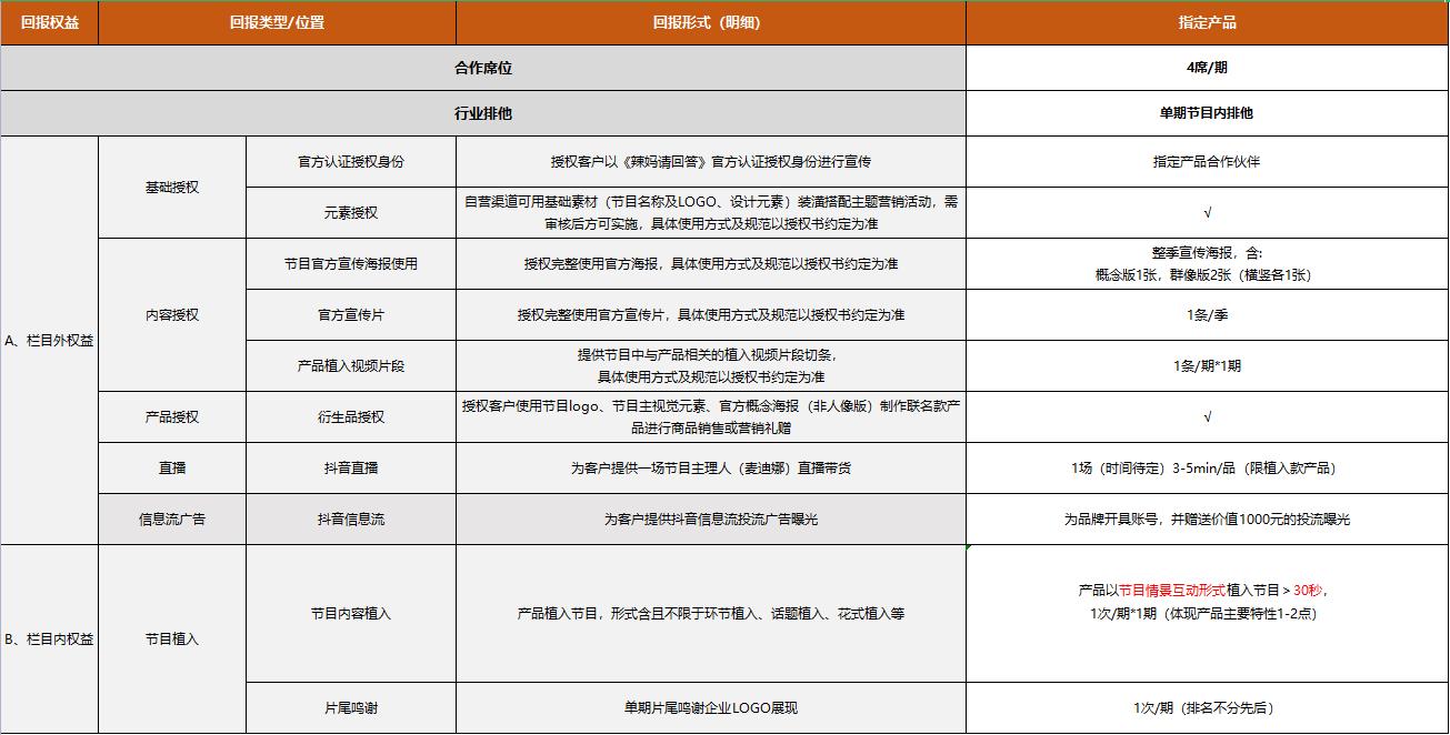 《星媽請(qǐng)回答》指定產(chǎn)品權(quán)益表