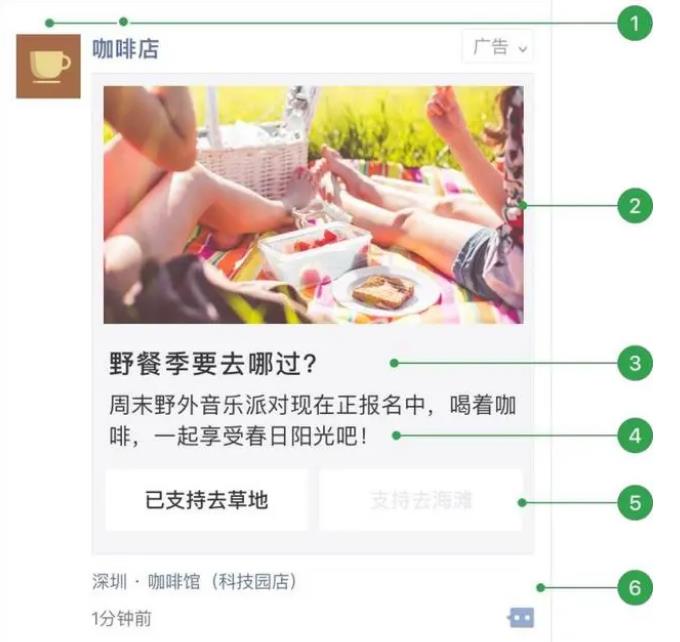2. 外層圖片、小視頻;3. 外層文案標(biāo)題(可選);4.外層文案詳情;5.門(mén)店標(biāo)識(shí)(有線(xiàn)下門(mén)店可選擇展示);6.用戶(hù)社交互動(dòng)。