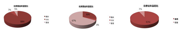 2、北京西站,高鐵數(shù)量占比67%,勱車數(shù)量占比30%,普速列車數(shù)量占比3%。通過對比顯示,北京西站發(fā)送列車主要以高速列車,勱車為主,包含京原線、京九線、京包線、京廣線