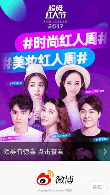 微博上的曝光類(lèi)廣告也就是我們常說(shuō)的開(kāi)屏廣告,主要優(yōu)勢(shì)就是用戶(hù)在打開(kāi)APP的瞬間看到,很容易吸引用戶(hù)的眼球,容易使用戶(hù)記住我們的廣告;另外廣告是強(qiáng)制性推送給用戶(hù),廣告到達(dá)率是100%,是每個(gè)用戶(hù)打開(kāi)APP必須要看到的一則廣告,無(wú)法避免,非常適合品牌宣傳類(lèi)投放。